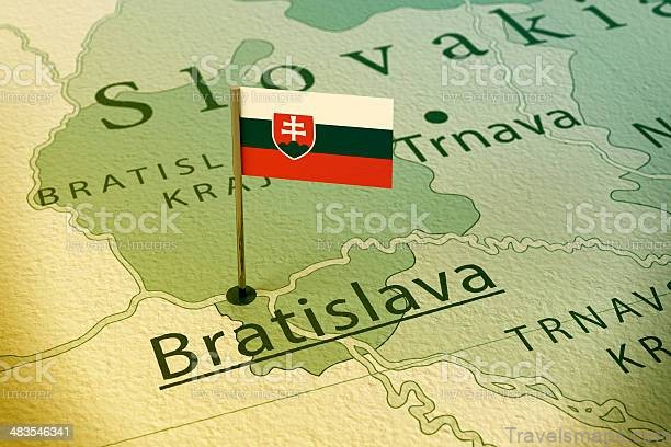 3D Render of a Slovakian Flag Pin at the Position of the City of Bratislava on a Map of Slovakia. Vintage Color Style. Very high resolution available!